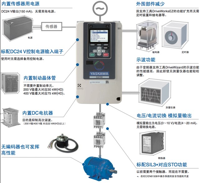 通過在變頻器主體上加入外圍設(shè)備的功能,從而不需要外圍設(shè)備,可節(jié)省空間、接線及人力,降低總成本。