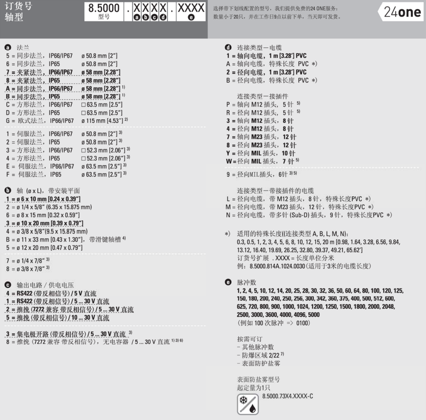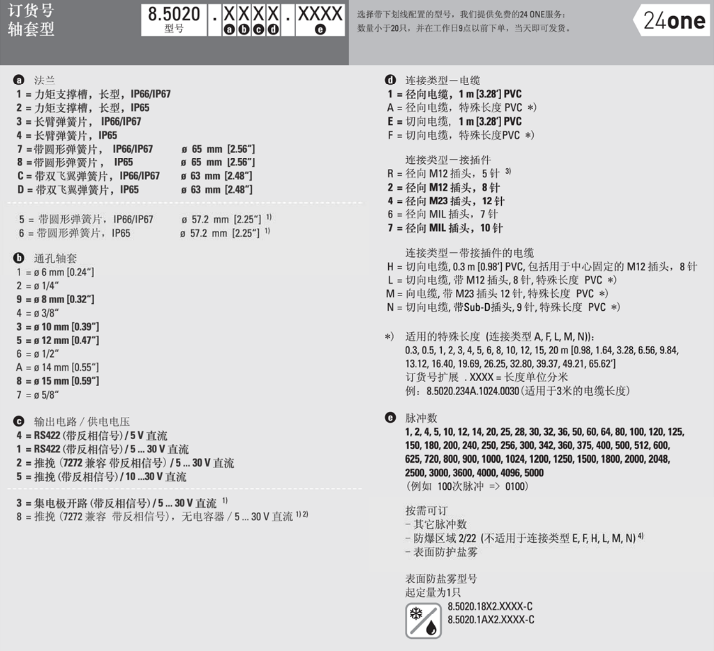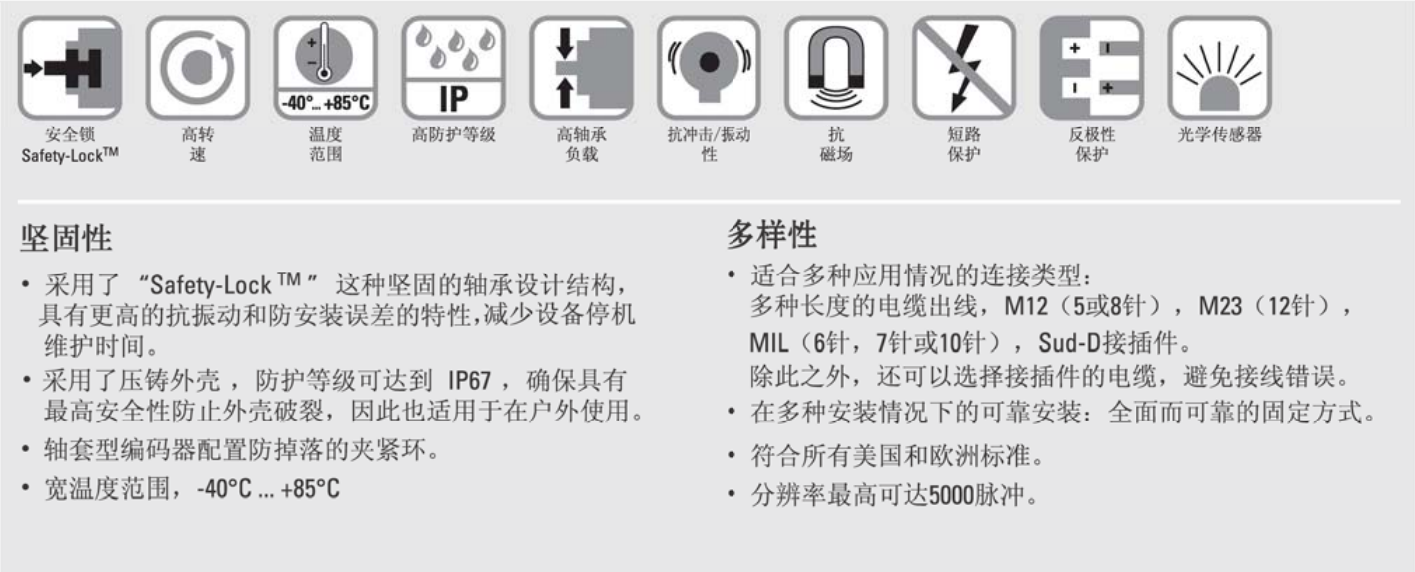 標準型光學增量式編碼器 Sendix 5000 和 5020 系列編碼器采用了安全鎖( Safety-Lock? )的堅固軸承設計結構,可以提供更高的抗振動性和防安裝誤差 具有堅固的外殼,防護等級可達到 IP67 工作溫度范圍從 -40 °C到+85 °C,獨特的各種變體,極強的適應性 分辨率每圈5000次脈沖 軸或軸套選擇,直徑可達12mm,3/8"軸,帶平面 咨詢熱線:18668169779 在線咨詢 產(chǎn)品詳細 上一篇:經(jīng)濟型緊湊型光學增量式編碼器 下一篇:經(jīng)濟型標準型光學增量式編碼器 用手機看 拍下二維碼,信息隨身看 試試用手機掃一掃, 在你手機上繼續(xù)觀看此頁面。